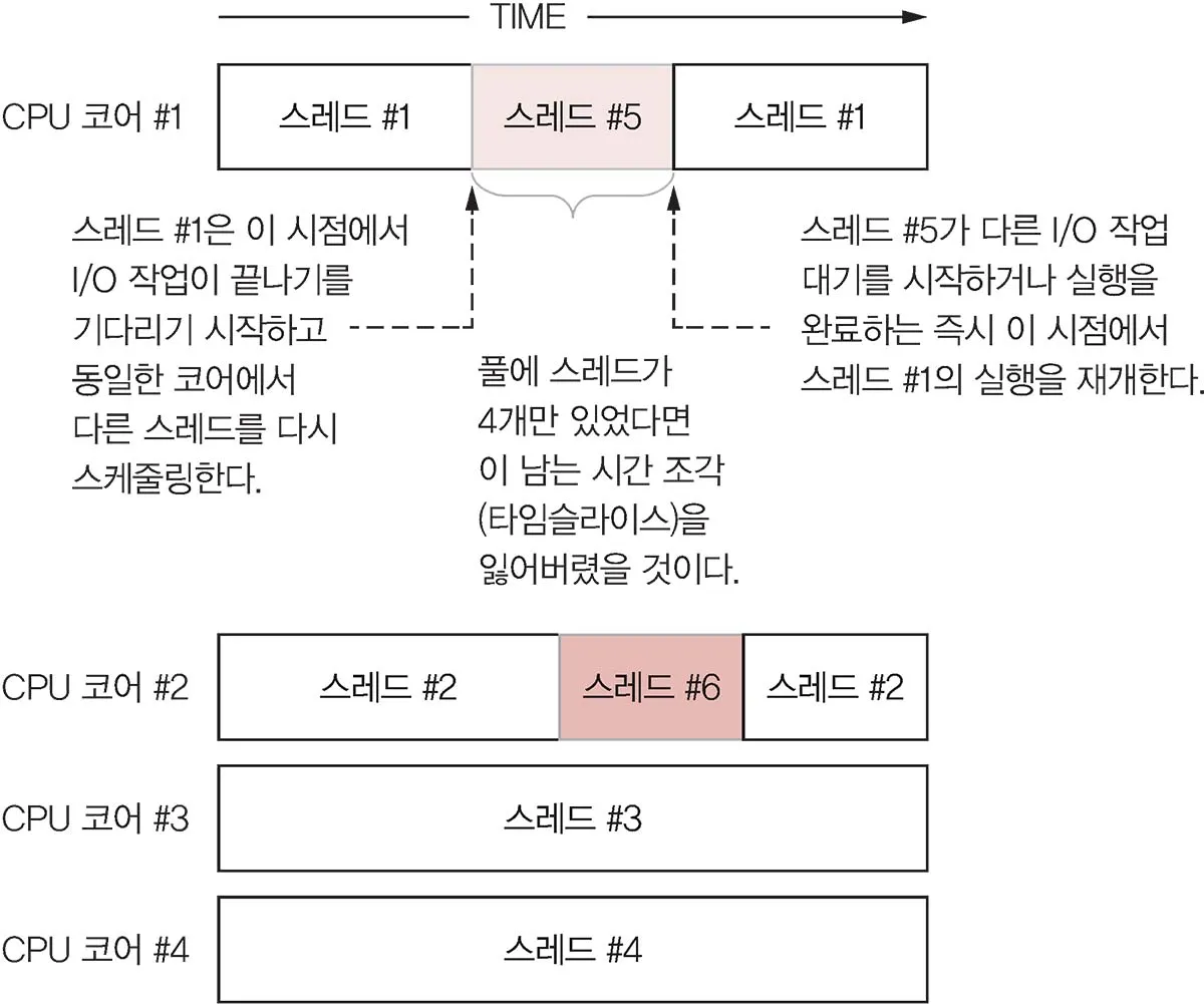 스레드 풀에는 대개 시스템의 CPU 코어 수보다 더 많은 스레드가 있는데, 이는 스레드가 종종 I/O와 같은 다른 작업이 끝날 때까지 대기해야 하기 때문이다.
