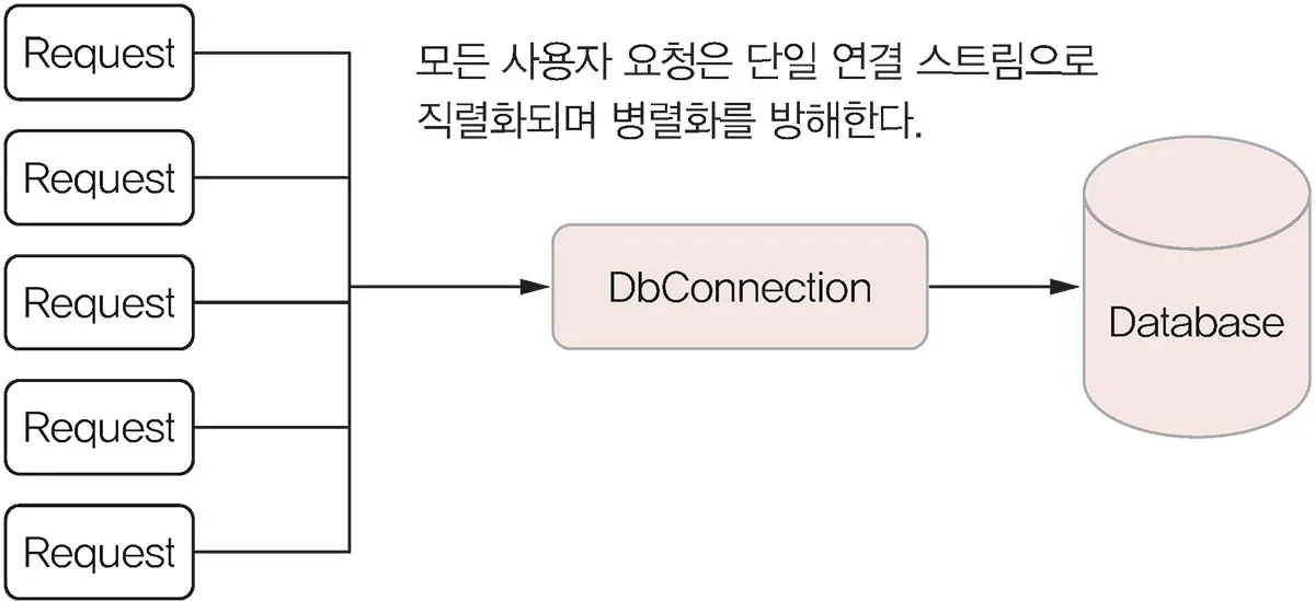 데이터베이스에 대한 단일 커넥션을 하나 생성한 후, 이를 다른 코드에서 공유하는 것은 범하기 쉬운 잘못된 아이디어다.