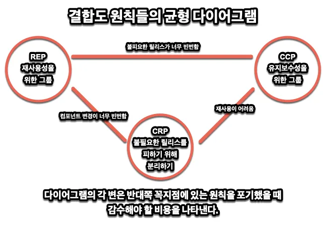 : 공통 재사용 원칙도 클래스와 모듈을 어느 컴포넌트에 위치시킬지 결정할 때 도움이되는 원칙, CRP에서는 같이 재사용되는 경향이 있는 클래스와 모듈들은 같은 컴포넌트에 포함