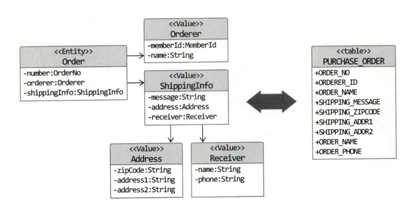 : 루트 엔티티인 Order는 @Entity로 매핑, 밸류인 Orderer, ShippingInfo, Address, Receiver는 @Embeddable로 매핑한다.