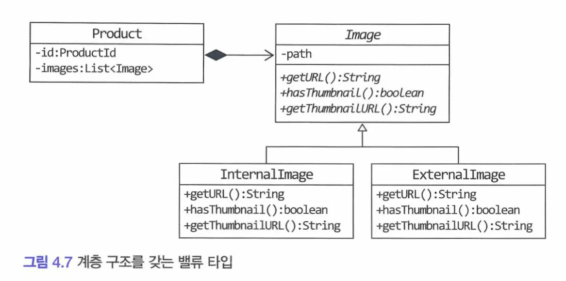 : 예로 제품의 이미지 업로드 방식에 따라 이미지 경로와 섬네일 이미지 제공 여부가 달라질 때, JPA는 @Embeddable 타입의 클래스 상속 매핑을 지원하지 않는데 상속 구조를 갖는 밸류 타입을 사용할려면 @Entity를 이용해서 상속 매핑으로 처리해야 한다.