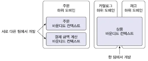 : 이 경우 주문 하위 도메인에 주문 바운디드 컨텍스트와 결제 금액 계산 바운디드 컨텍스트가 존재하게 된다.