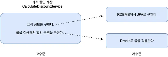 : CalculateDiscountService가 RuleDiscounter를 사용하도록 변경하면 더이상 Drools에 의존하는 코드가 존재하지 않는다. 단지 ‘룰을 이용한 할인 금액 계산’을 추상화한 RuleDiscounter 인터페이스에 의존할 뿐이다. ‘룰을 이용한 할인 금액 계산’은 고수준 모듈의 개념이므로 RuleDiscounter는 고수준 모듈에 속한다. DroolsRuleDiscounter는 고수준의 하위 기능인 RuleDiscounter를 구현한 것이므로 저수준 모듈에 속한다.