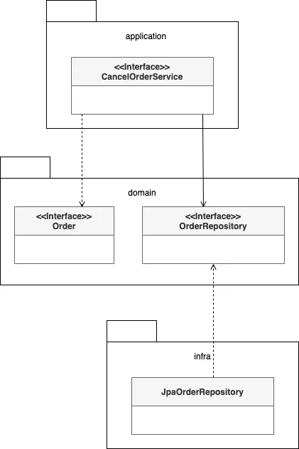: 도메인 모델의 입장에서 OrderRepository는 도메인 객체를 영속화하는데 필요한 기능을 추상화한 것으로 고수준 모듈에 속한다. 기반 기술을 통해 OrderRepository를 구현한 클래스는 저수준 모듈로 인프라스트럭처 영역에 속한다.
