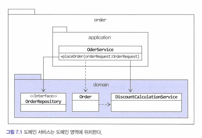 : 도메인 서비스의 개수가 많거나 엔티티나 밸류와 같은 다른 구성요소와 명시적으로 구분하고 싶다면 domain 패키지 밑에 model, service, repository와 같이 하위 패키지를 구분하여 위치시켜도 된다.