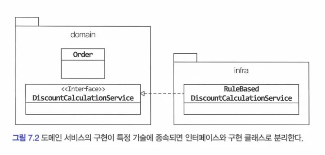 : 도메인 서비스의 구현이 특정 기술에 의존하거나 외부 시스템 API 를 실행한다면 도메인 영역의 도메인 서비스는 인터페이스로 추상화 해야한다.