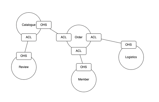 : 오픈 호스트 서비스(OHS)와 안티코럽션 계층(ACL)만 표시해도 하위 도메인이나 조직 구조를 함께 표시하면 도메인을 포함한 전체 관계를 이해하는데 도움이 된다.