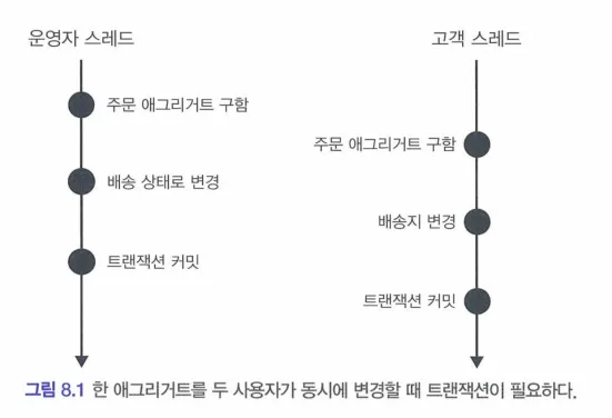 운영자와 고객이 동시에 한 주문 애그리거트를 수정할 때, 트랜잭션마다 리포지터리는 새로운 애그리거트 객체를 생성하므로 운영자 스레드와 고객 스레드는 같은 주문 애그리거트를 나타내는 다른 객체를 가져오게 된다.