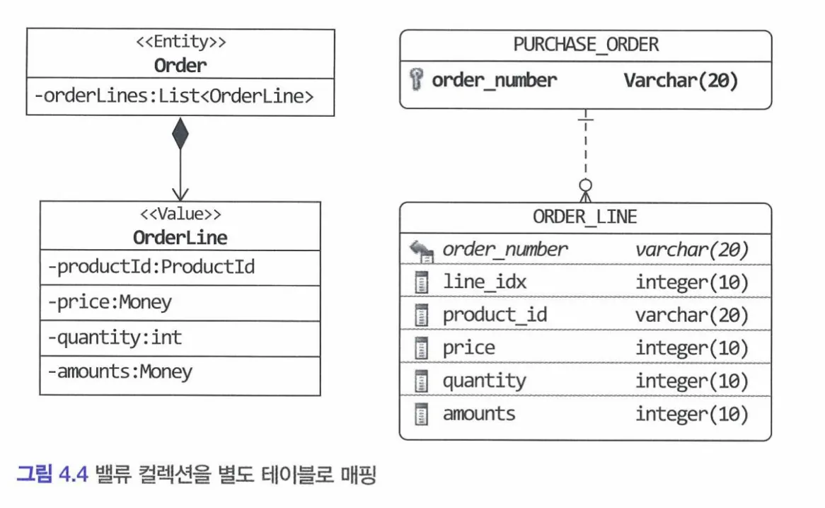 : 밸류 컬렉션을 저장하는 ORDER_LINE 테이블은 외래키를 이용해서 엔티티에 해당하는 PURCHASE_ORDER 테이블을 참조한다. 이 키는 컬렉션이 속할 엔티티를 의미한다. List 타입의 컬렉션은 인덱스 값이 필요하므로 ORDER_LINE 테이블에는 인덱스 값을 저장하기 위한 별도 칼럼인 line_idx도 존재한다.