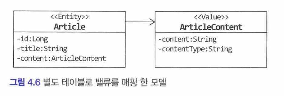 : 그림만 봤을 때 ARTICLE_CONTENT 테이블의 ID 칼럼이 식별자이므로 ARTICLE_CONTENT와 매핑되는 ArticleContent를 엔티티로 생각해서 Article과 ArticleContent를 두 엔티티 간의 1-1 연관으로 매핑할 수 있지만 ArticleContent를 Article의 내용을 담고 있는 밸류 타입으로 보는 것이 맞다.