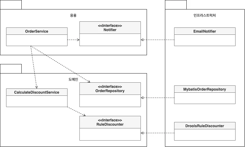 : CalculateDiscountService가 RuleDiscounter를 사용하도록 변경하면 더이상 Drools에 의존하는 코드가 존재하지 않는다. 단지 ‘룰을 이용한 할인 금액 계산’을 추상화한 RuleDiscounter 인터페이스에 의존할 뿐이다. ‘룰을 이용한 할인 금액 계산’은 고수준 모듈의 개념이므로 RuleDiscounter는 고수준 모듈에 속한다. DroolsRuleDiscounter는 고수준의 하위 기능인 RuleDiscounter를 구현한 것이므로 저수준 모듈에 속한다.
