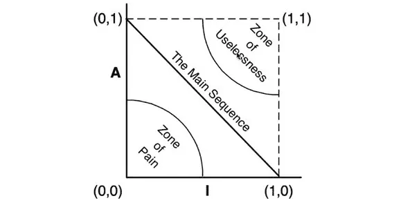 변동성이 큰 컴포넌트 대부분은 두 배제 구역으로부터 가능한 한 멀리 떨어뜨려야 한다.최대한 멀리 떨어진 점의 궤적은 (1, 0)과 (0, 1)을 잇는 선분이다. → 저자는 주계열(Main Sequence)이라고 부름주계열 위 또는 가깝게 위치해야 하며, 이렇게 위치하면 '너무 추상적'이지도 않고, 추상화 정도에 비해 '너무 불안정'하지도 않다.
