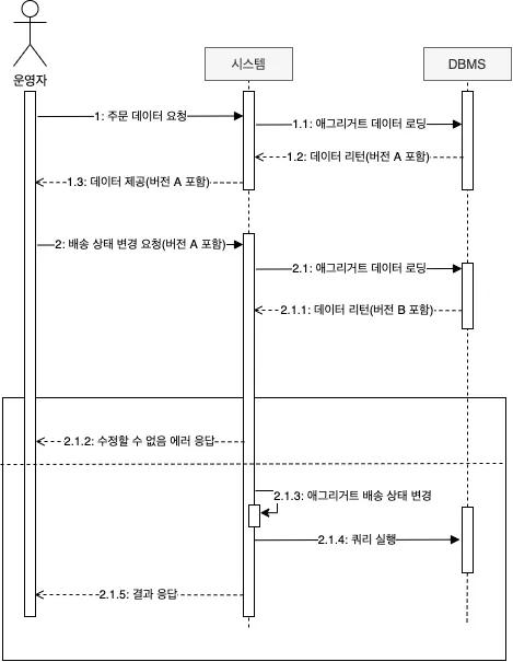 과정 2에서 운영자는 배송 상태 변경을 요청할 때 앞서 과정 1을 통해 받은 애그리거트 버전 값을 함께 전송한다. 시스템은 애그리거트를 조회할 때 버전 값도 함께 읽어온다.