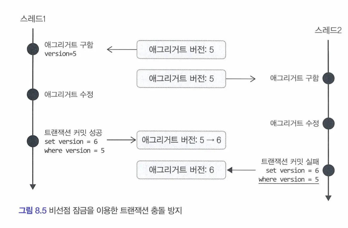 : 사용자가 전송한 버전과 애그리거트 버전이 동일한 경우에만 애그리거트 수정 기능을 수행하도록 함으로써 트랜잭션 충돌 문제를 해결할 수 있다.