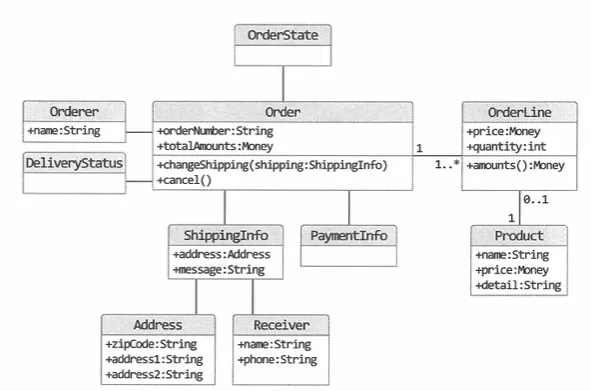 : 도메인 모델에는 다양한 정의가 존재하는데, 기본적으로 도메인 모델은 특정 도메인을 개념적으로 표현한 것, 주문 도메인은 온라인 쇼핑몰의 경우 주문 시 상품을 몇 개 살지 선택하고 배송지를 입력한다. 선택한 상품 가격을 이용해서 총 지불 금액을 계산하고 금액 지불을 위한 결제 수단을 선택, 주문한 뒤에도 배송 전일 경우 배송지 주소를 변경하거나 주문을 취소할 수 있음, 이를 위한 주문 모델을 객체모델로 구성하면 다음과 같이 만들 수 있음