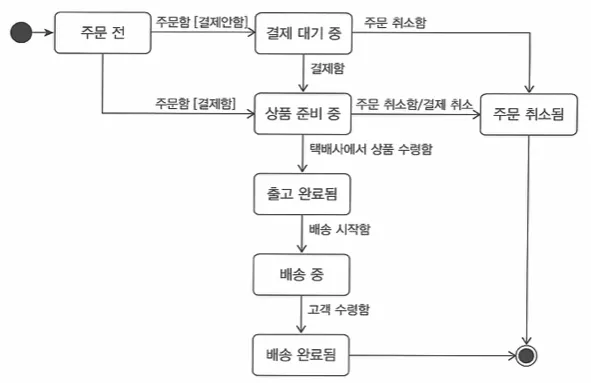 : 도메인 모델을 객체로만 모델링할 수 있는 것은 아님, 상태 다이어그램을 이용해서 주문의 상태 전이를 모델링할 수 있음, 이 다이어그램을 보면 상품 준비 중 상태에서 주문을 취소하면 결제 취소가 함께 이루어진다는 것을 알 수 있음