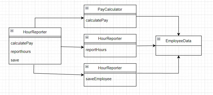 : 이 세 메서드를 Employee라는 단일 클래스에 배치하여 회계팀, 인사팀, 데이터베이스 관리자라는 세 액터가 결합되어 버렸음